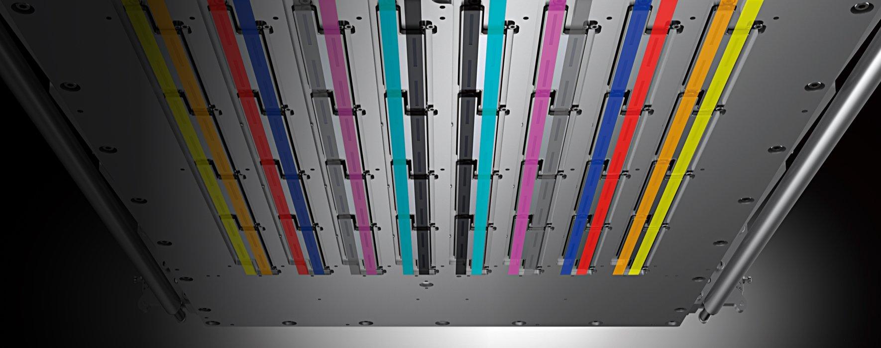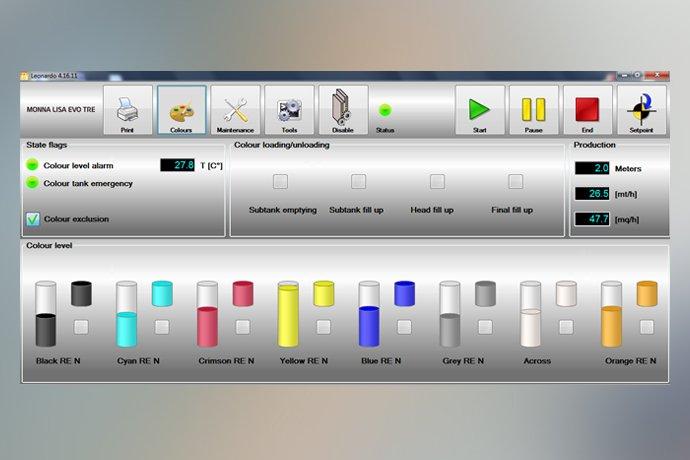 Les touches de fonction sont réparties en 3 groupes distincts : contrôles de l'imprimante, gestion de la conception, sélection de l'interface de surveillance. Les mètres imprimés sont affichés en continu sur trois écrans, avec les données relatives à la production horaire divisée en mètres linéaires et en mètres carrés. Le contrôle et la gestion des couleurs chargées dans l'imprimante sont simplifiés grâce à une représentation visuelle illustrant la situation actuelle en temps réel. En plus des niveaux, d'autres messages indiquent le statut de l'encre, indiquant à l'opérateur non seulement lorsque les cartouches sont vides, mais également tout problème due à des erreurs lors du chargement.